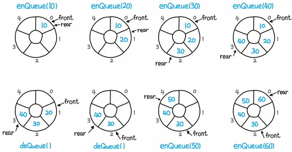원형 큐는 포인터 두개가 계속해서 움직여 Front와 Rear를 조정해주는 구조를 가지고 있습니다. 이러한 구조를 통해 원형 구조를 만들게 되는데, 이는 데이터들을 재배치하지 않아도 되는 이점이 있습니다.