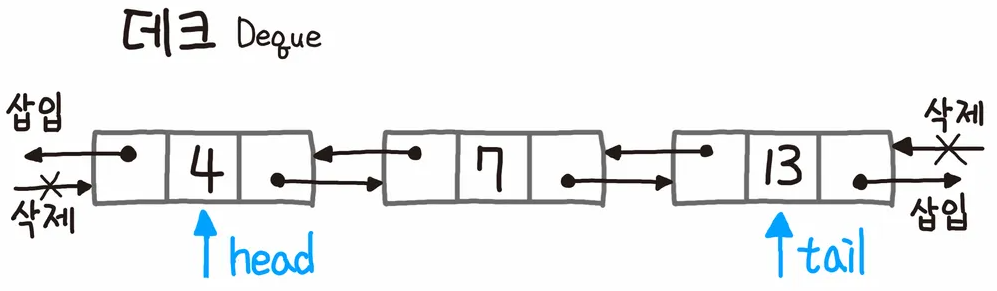 데크의 구조는 위와 같으며, 양쪽 끝에서 삽입 및 삭제가 이루어집니다.