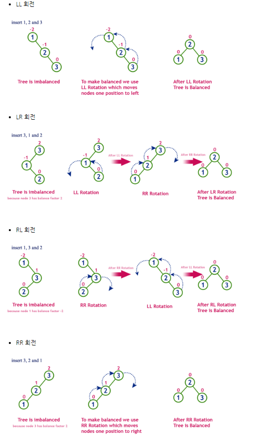 AVL 트리는 노드가 삽입 / 삭제될 때 트리의 균형을 유지하기 위해 BF를 체크하여 다음과 같은 회전 연산을 합니다.