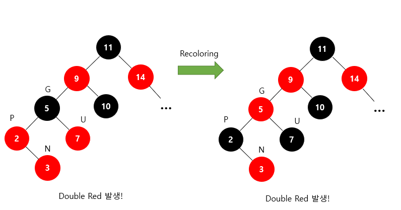 이때 빨간색 노드가 연속으로 등장하는 double red가 발생할 수 있습니다.