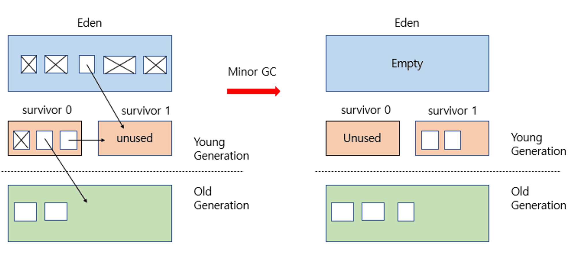 참조되지 않는 객체의 메모리 해제 및 살아남은 객체는 Survivor 0, 1 중 객체가 존재하는 쪽으로 이동