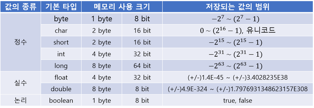 모든 변수는 타입을 가지고 있으며, 타입에 따라 저장할 수 있는 값의 종류와 범위가 달라지게 됩니다.