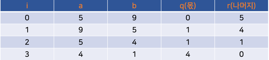 그 후, 유클리드 호제법을 이용하여 몫과 나머지를 저장합니다.