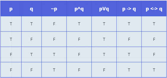 명제의 진리값을 표로 나타낸 것으로 5가지 연결사들에 대한 진리표는 다음과 같습니다.