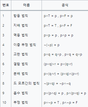 - p ∨ (q ∧ r) ≡ (p ∨ q) ∧ (p ∨ r) : 분배 법칙