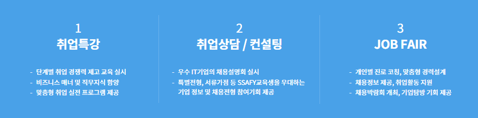 또한, 직장인 분들의 경우에 4대보험이 SSAFY 입과일 안에 온전히 정리가 되어야 교육을 들을 수 있으므로 퇴사 후 정리가 얼마나 걸리는지를 잘 알아보시고 지원하시길 바랍니다.