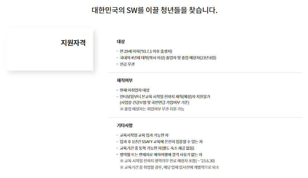 참고로 재외국민의 경우, 지원자격이 아니므로 재외국민이시라면 SSAFY 사무국에 연락을 해서 지원 자격에 적합한지 문의해 보시는 것이 좋습니다.